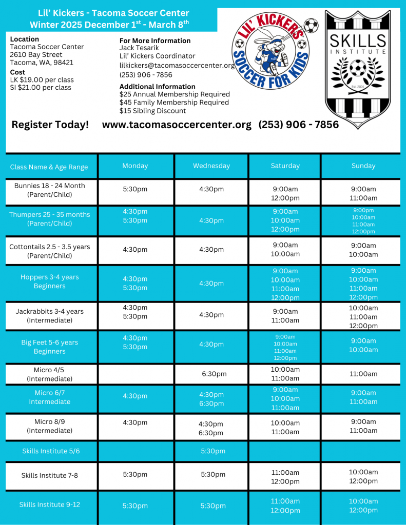 Registration opens to the public November 10th, and spots fill quickly. Give your child a winter full of growth, confidence-building, and exciting soccer activities with Lil’ Kickers and Skills Institute.